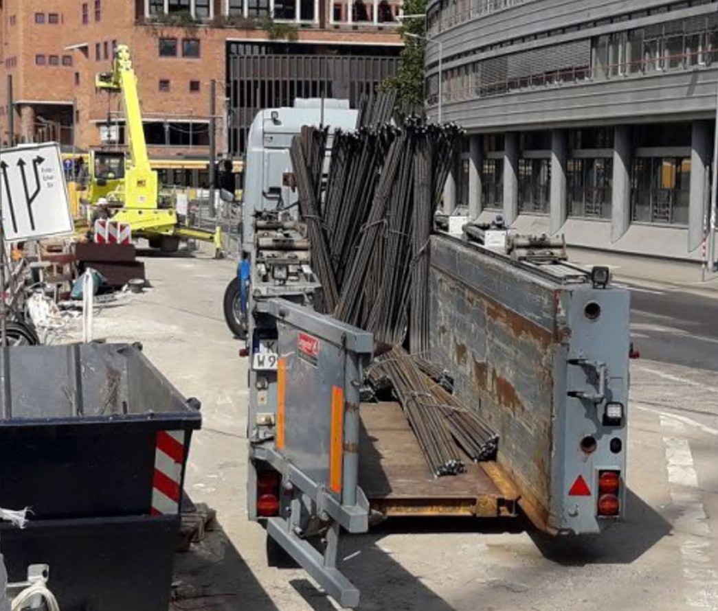 Bei der Kombination von L-förmigen Bewehrungsstäben, bei denen beide Schenkel > 2,40 m sind, kann die Bewehrung zur Not mit Spezialaufliegern (Innenlader) transportiert werden (s. Bild). Dies verursacht i.d.R. jedoch Mehrkosten.