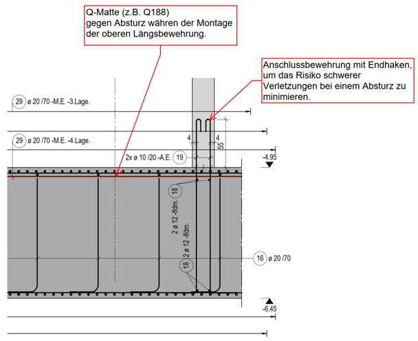 Beim Absturz von Personen besteht die Gefahr, dass herausragende Anschlussbewehrungen zu schweren Verletzungen führen, indem sie die Person aufspießen.
